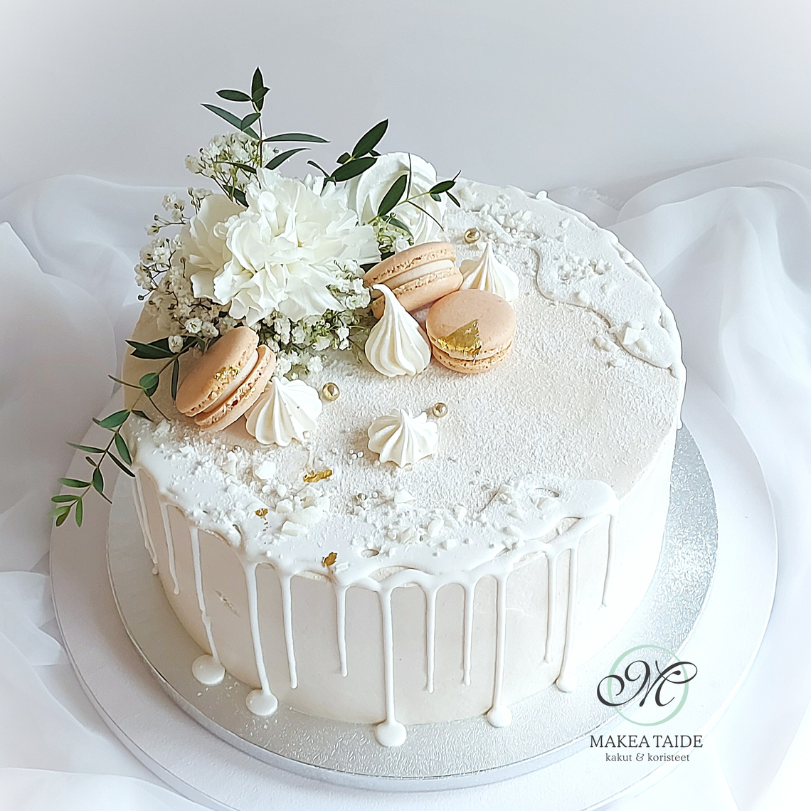 Marenkivoikreemi-kuorrutteinen kakku n.20hlölle. Teemaväreinä kakussa valkoisen lisäksi harmaa ja hopea. Koristeena aito valkoinen pioni.