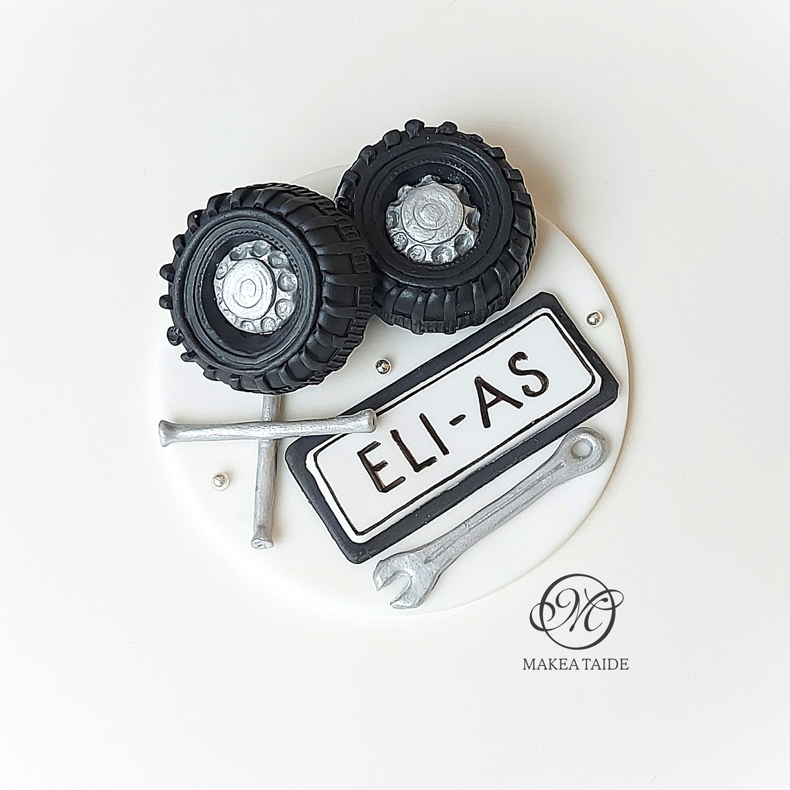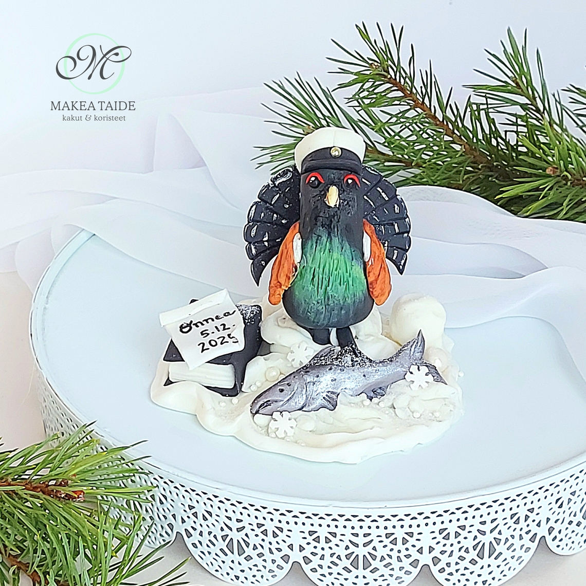 Yo- kakunkoriste isolla sokerimassaruusulla, kirjapinolla ja Yo-lakilla. Tilaajan toivevärein.