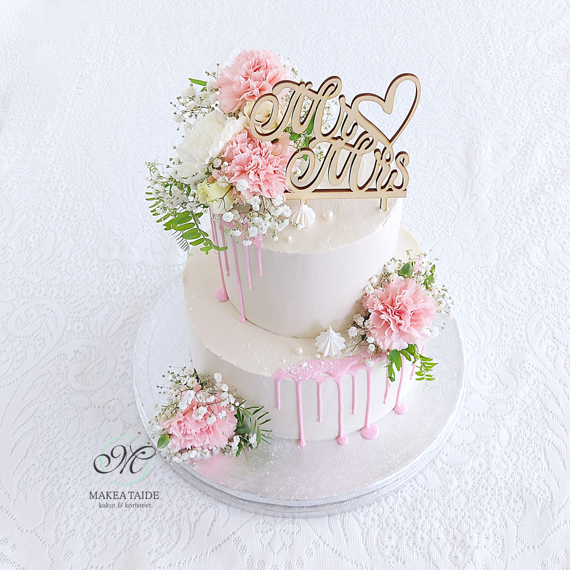 Kerroskakku romanttisin laastikermareunoin, koristeena neilikkaa ja valkoista harsokukkaa.