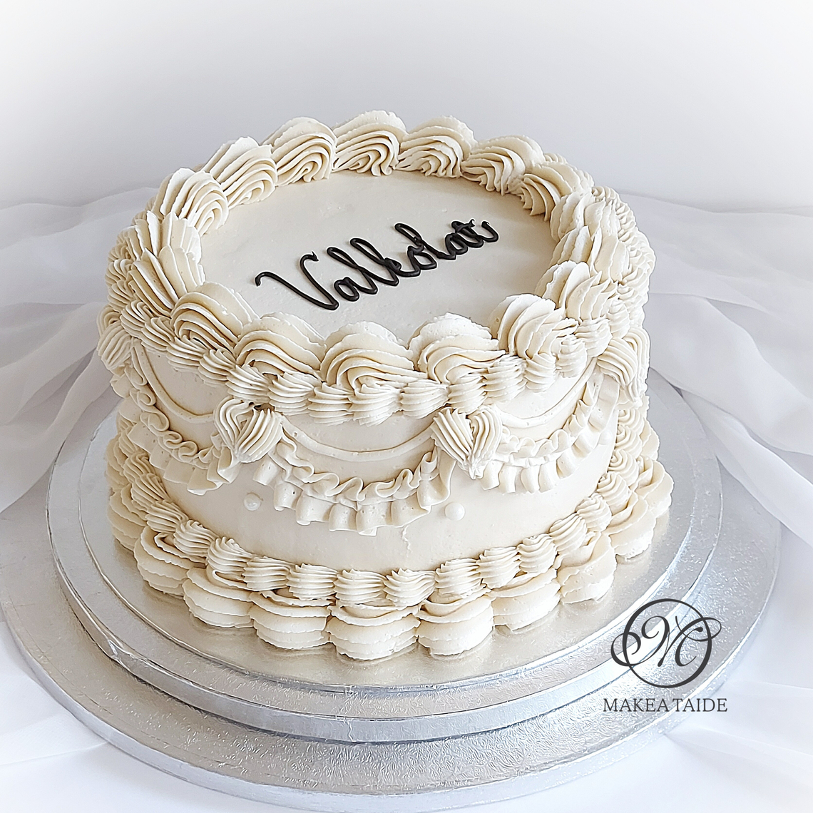 Korkea kaksikerroksinen hääkakku on toteutettu morsiamen toiveiden mukaan. Tuhti vaniljakakkupohja, kolmella täytevälillä vadelma- ja vaniljamousset.