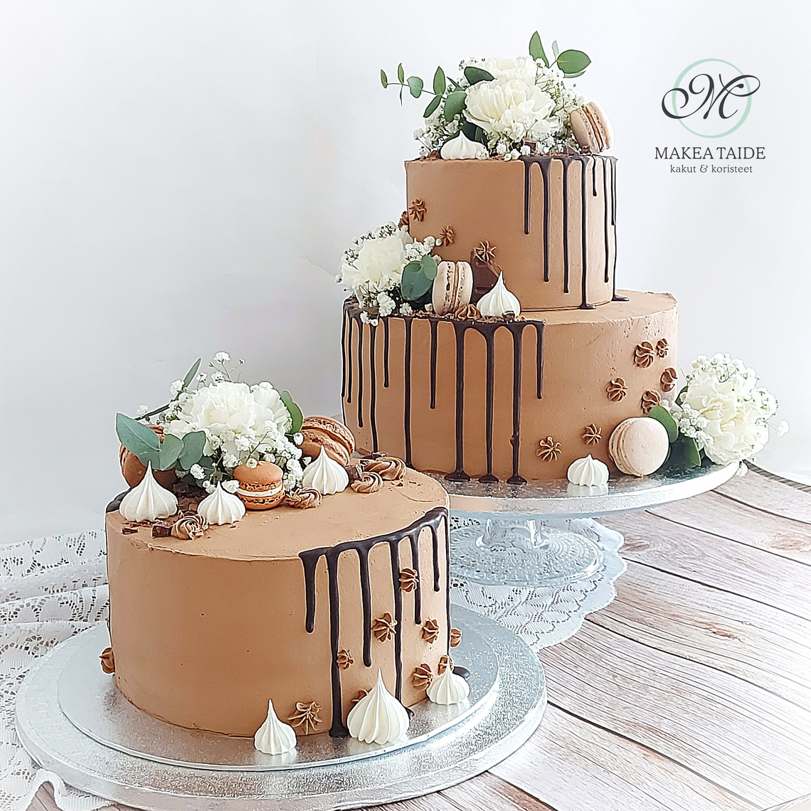 30hlö:n Hääkakku suklaakreemikuorrutuksella sekä suklaavalumilla. Koristeena aidot ruusut.