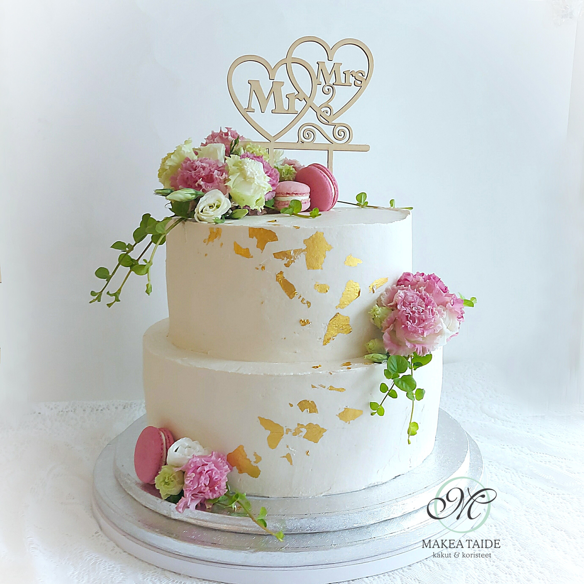 Kerroskakku romanttisin laastikermareunoin, koristeena neilikkaa ja valkoista harsokukkaa.