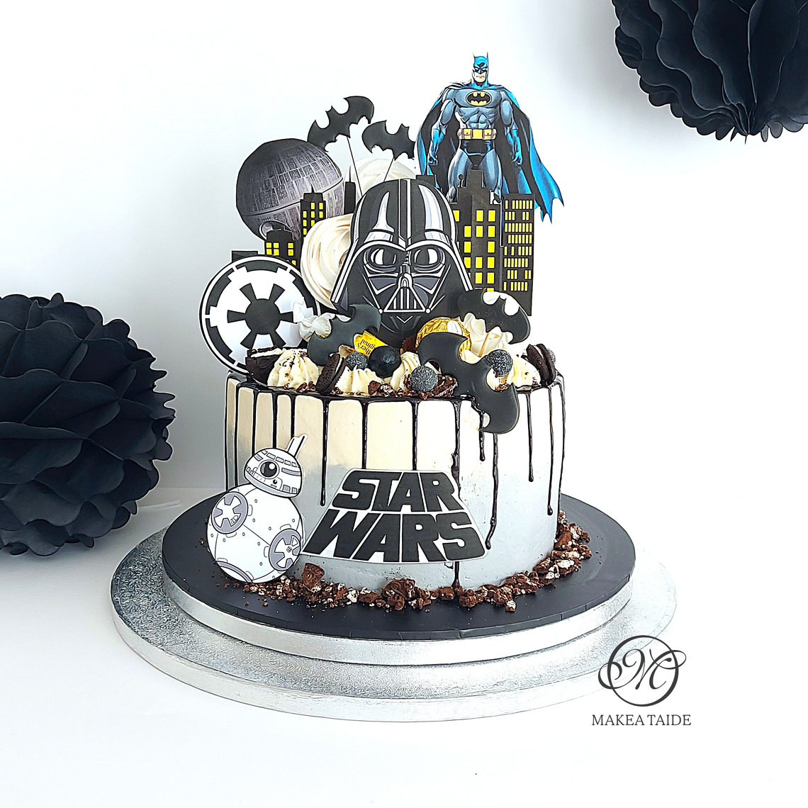valkoinen marenkivoikreemipintainen kakku jossa musta candymeltsvaluma ja kultakoristelua.