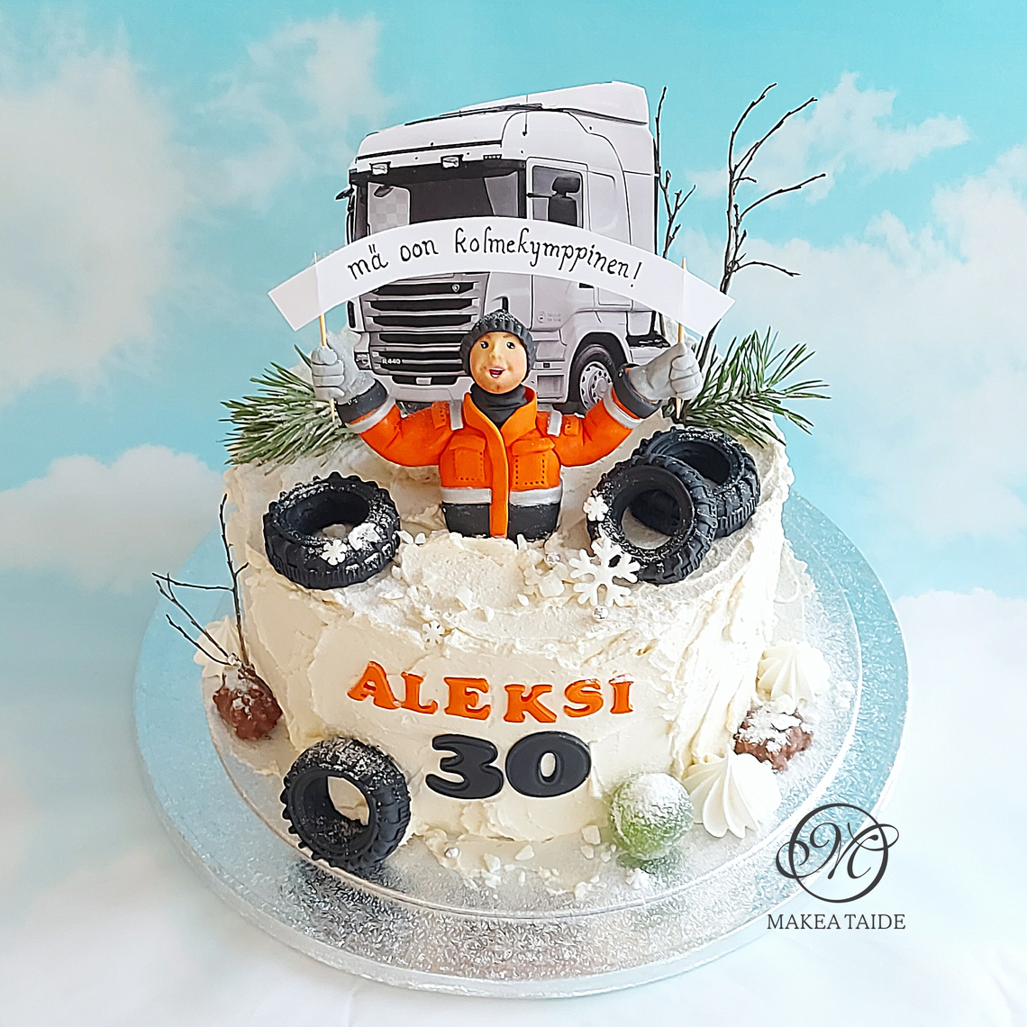 Kakku koneurakoitsijalle. Kaikki koristeen käsin valmistettuja.