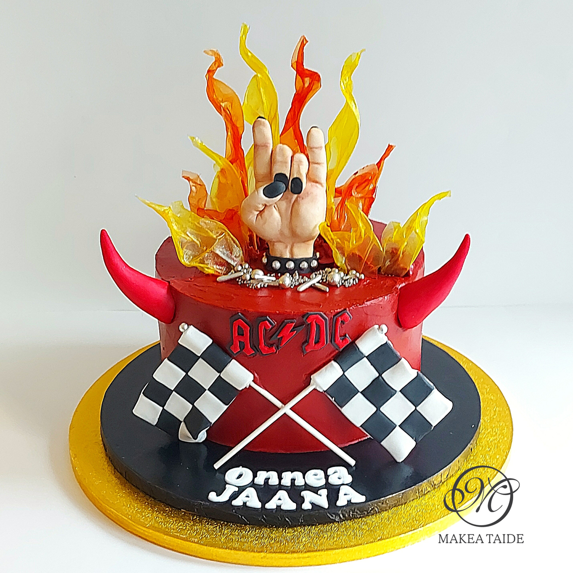Kakun koristelussa huomioitu päivänsankarin lahjaksi saama kitara, sekä yllätysmatka kaukomaille.