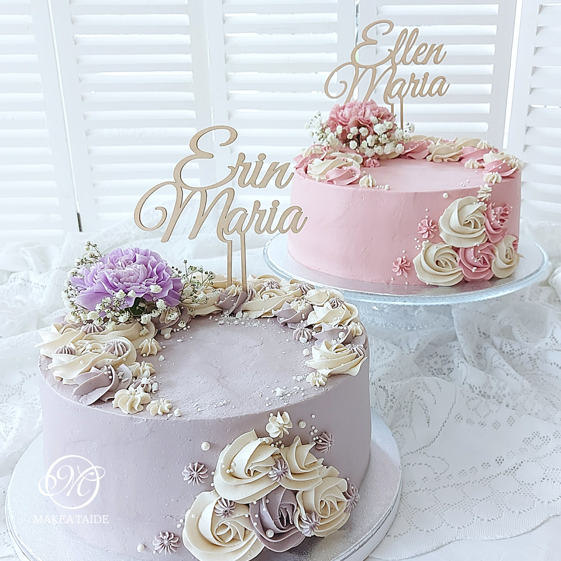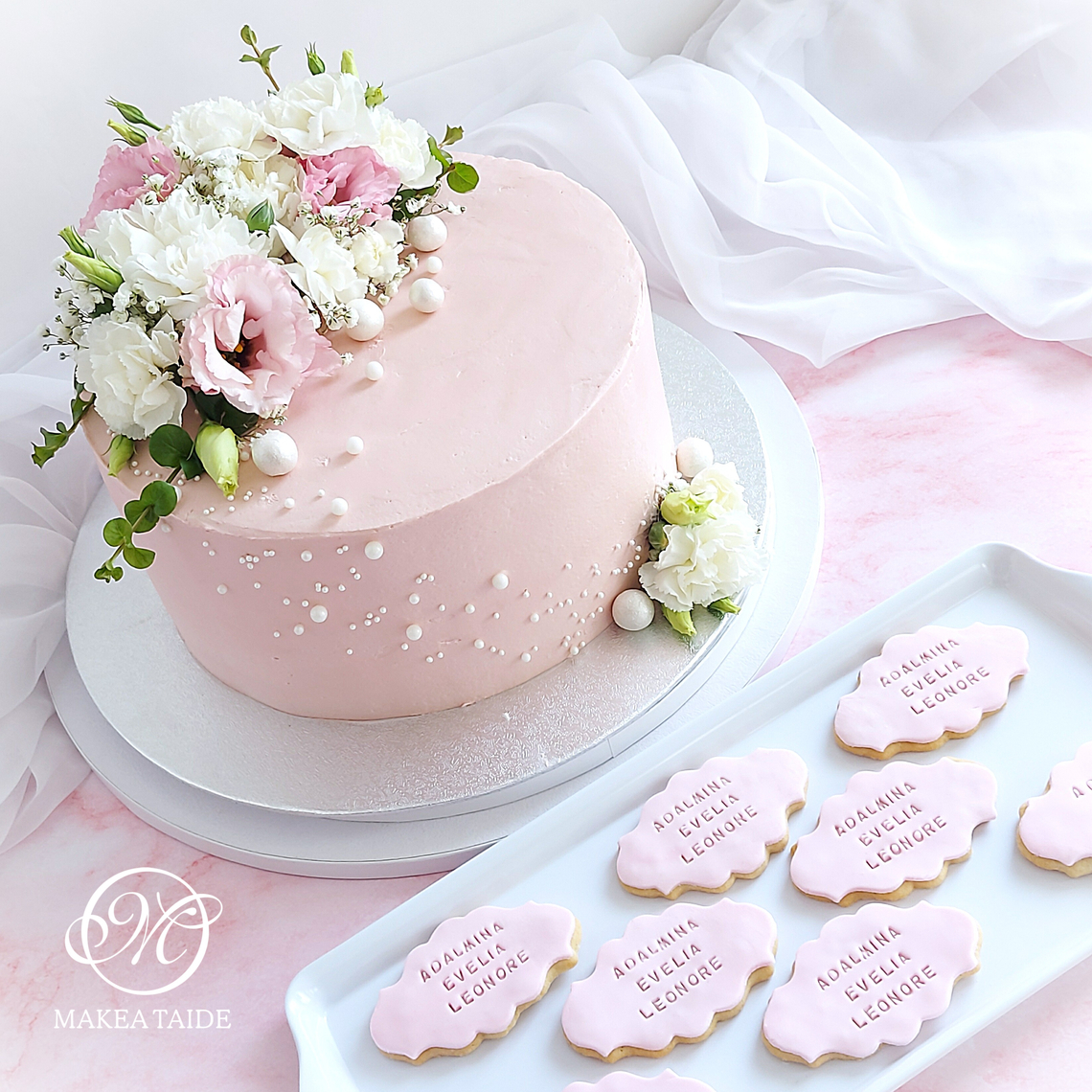 Kakussa liukuvärjätty marenkivoikreemipinta, vaaleansiniset valumat, aitoja kukkia, macaronsia sekä puinen nimikyltti. Tiesithän, että nimikyltin voit tilata kätevästi suoraan kakkuun kakkutilauksen yhteydessä.