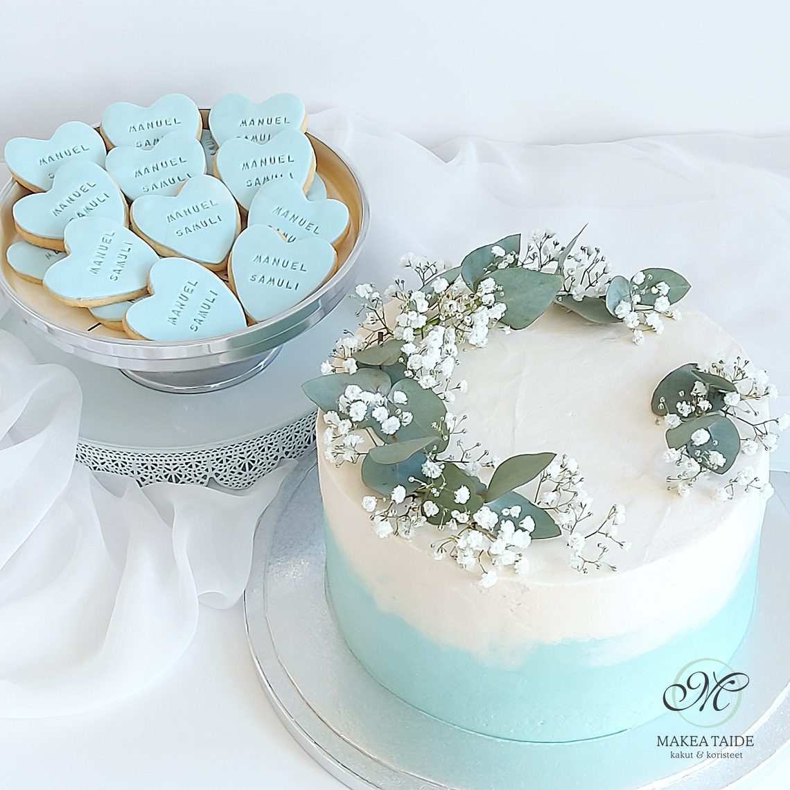 Hempeä vaalean sininen kakku mitoitettu 30hlölle.
