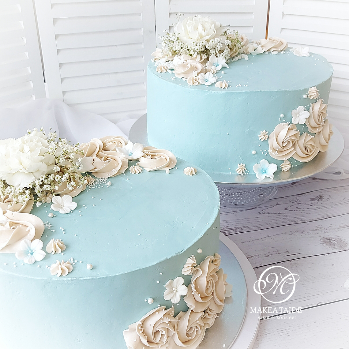 Hempeä vaalean sininen kakku mitoitettu 35+hlölle.