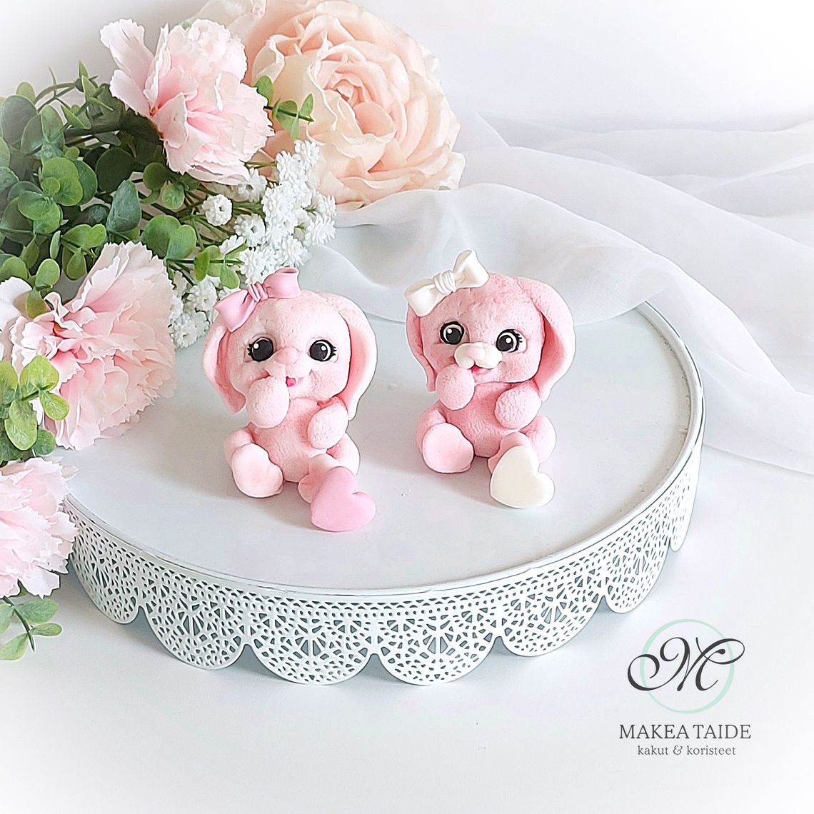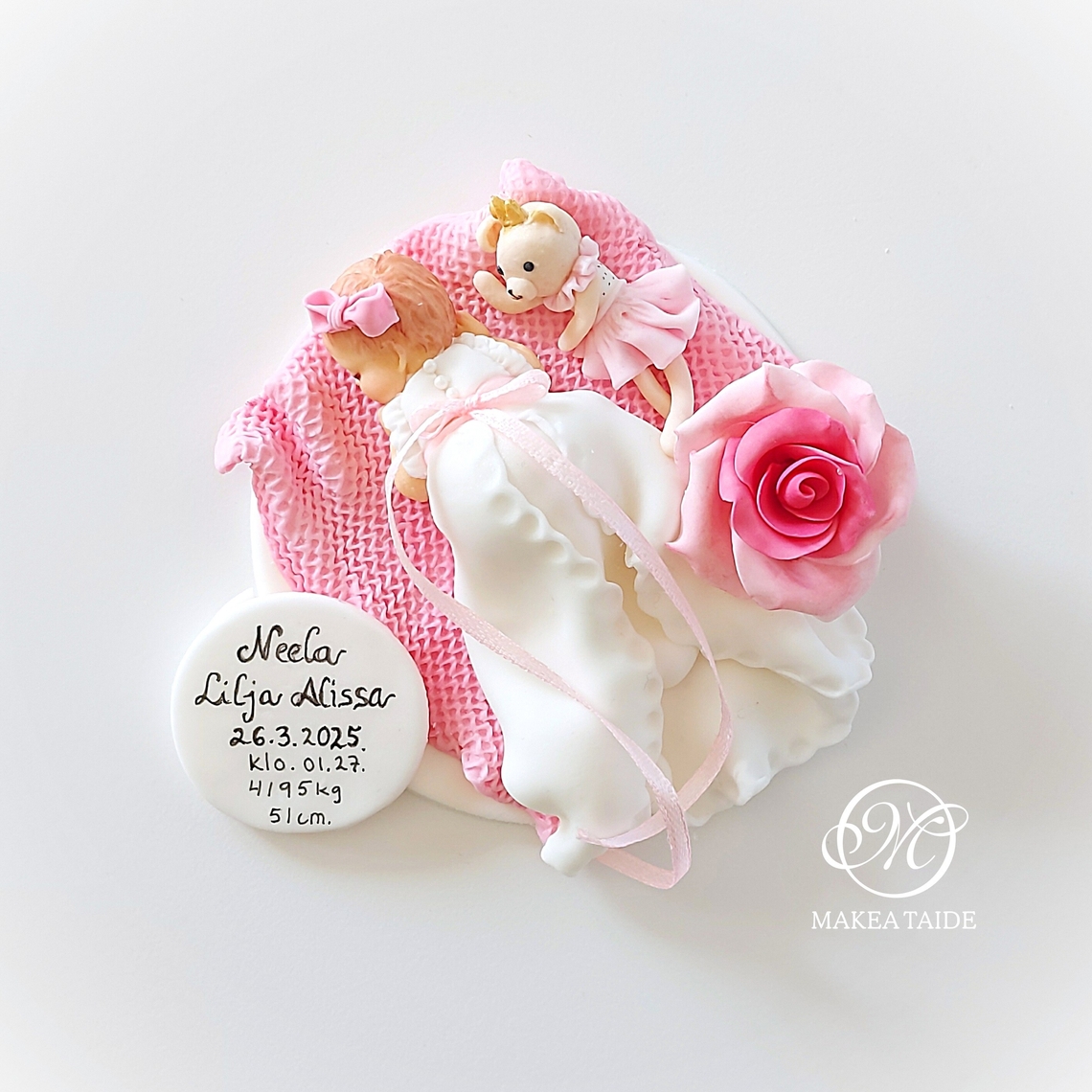 Sokerimassasta valmistettu nalle, sekä puinen Suomalaiselta valmistajalta tilattu nimikyltti.