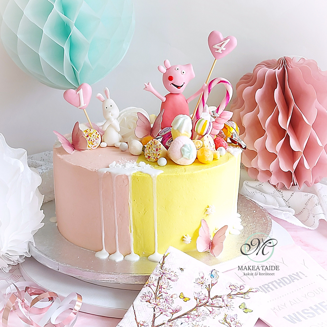 Värikäs täytekakku käsityönä valmistetuilla koristeilla.