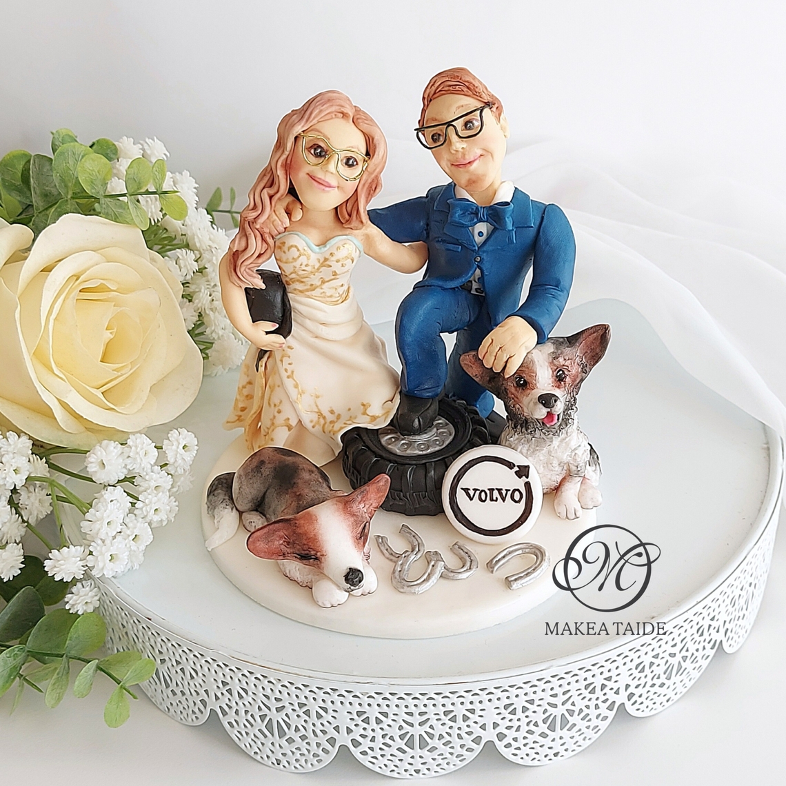 Hääpari valmistettu valokuvia apuna käyttäen. Mukana pariskunnan lemmikit, harrastukset myös huomioitu, ratsastus ja autoilu.