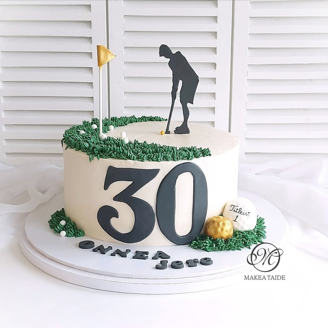 valkoinen marenkivoikreemipintainen kakku jossa musta candymeltsvaluma ja kultakoristelua.